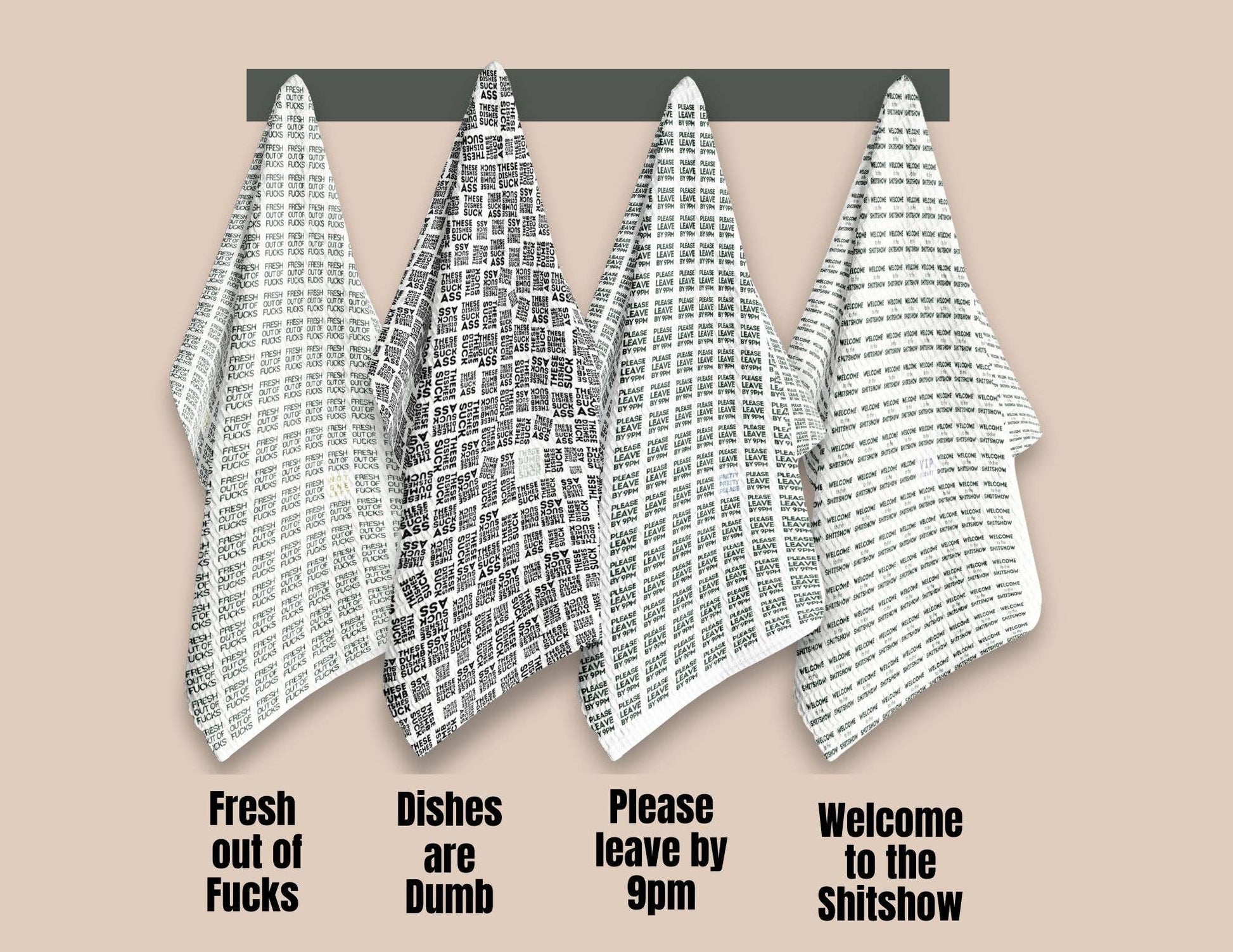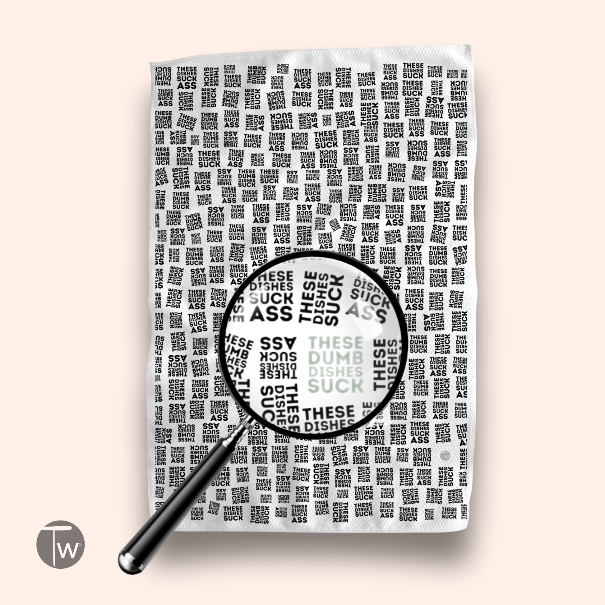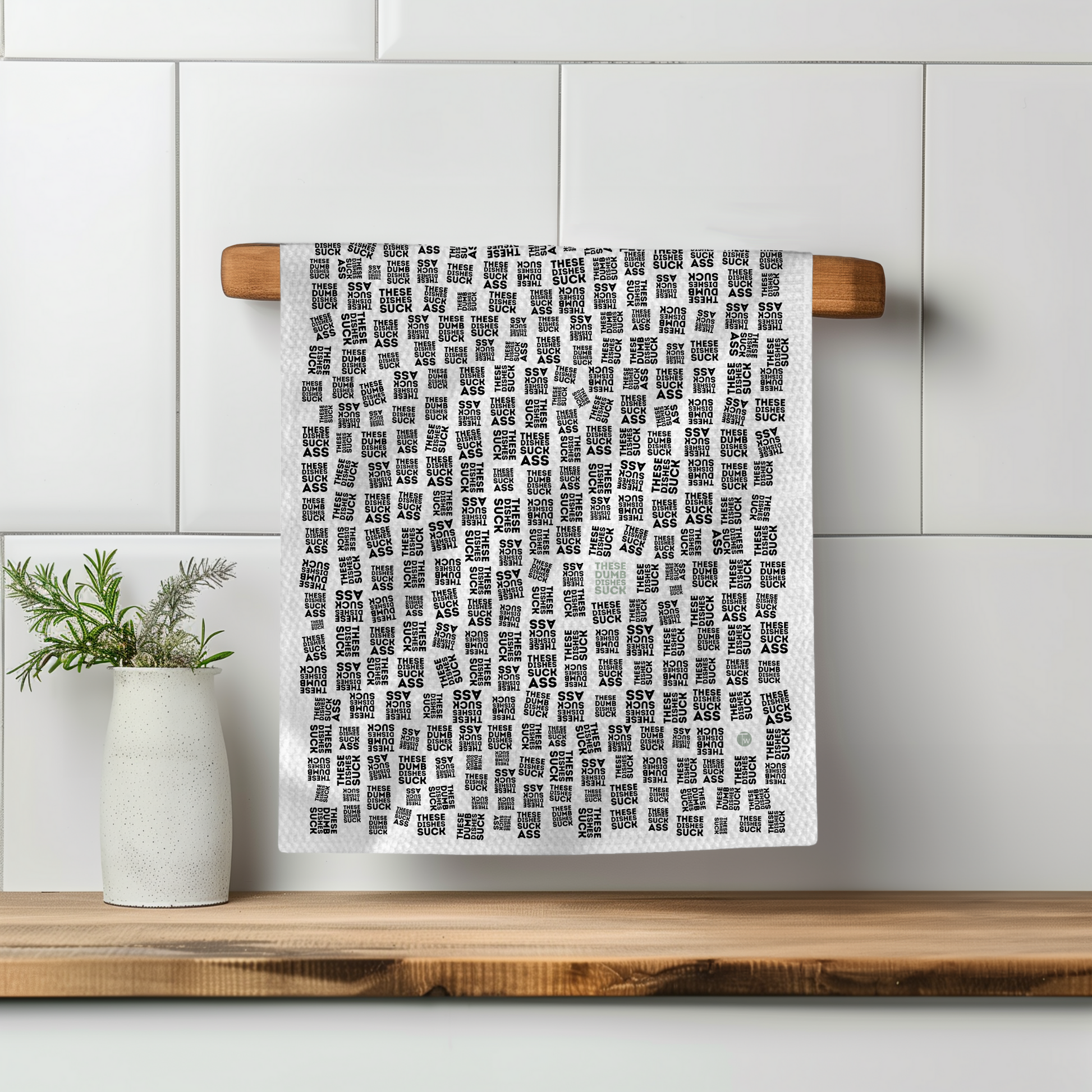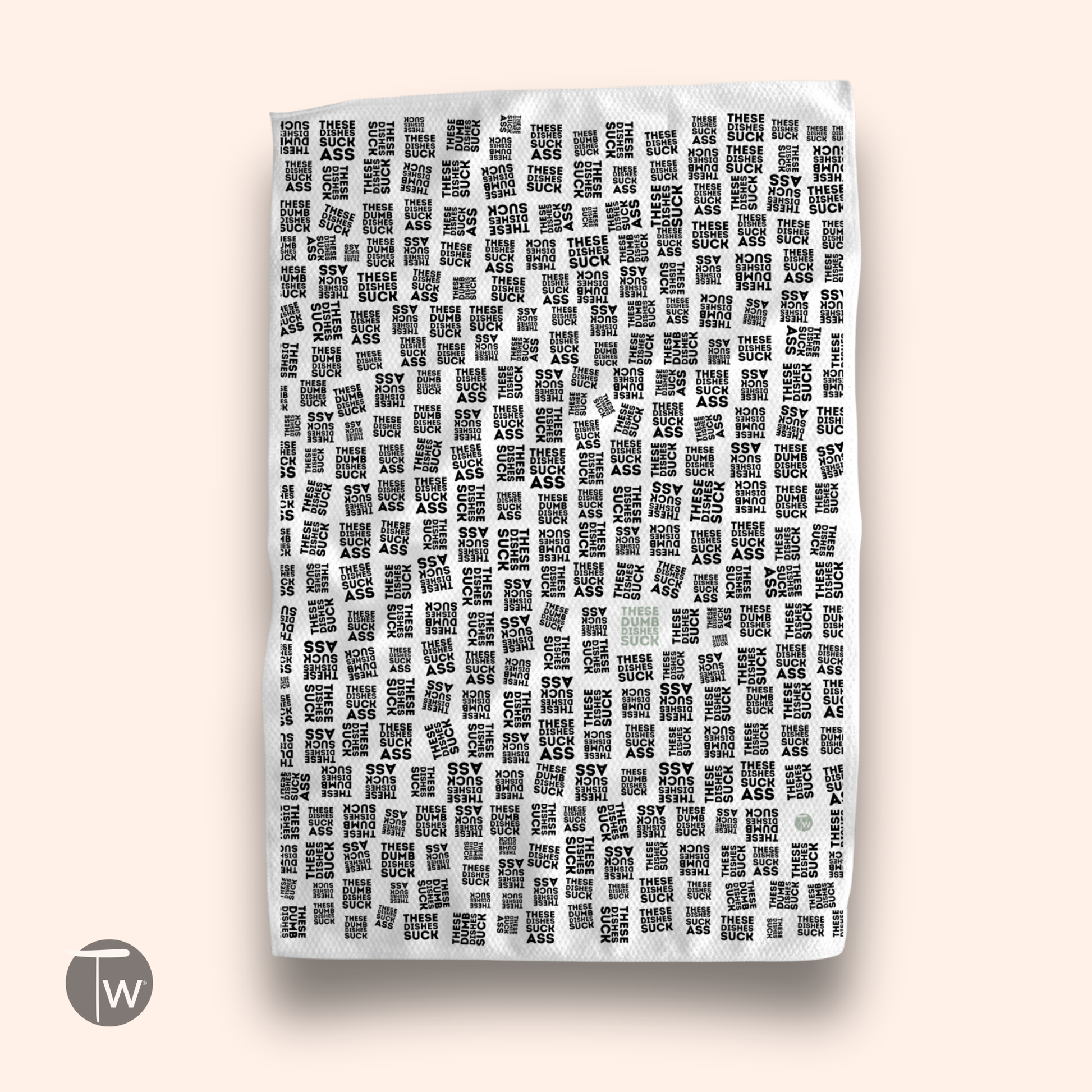 Wipe up the monotony with our towel that hilariously declares, "These Dishes Suck Ass." This kitchen sidekick soaks up suds and turns kitchen drudgery into a comedy show!