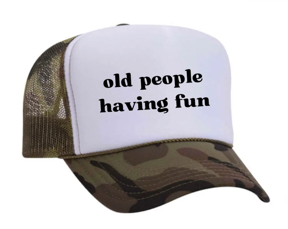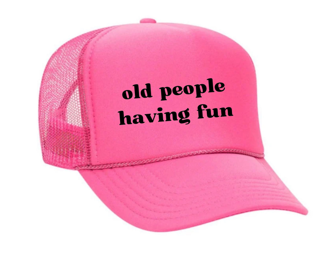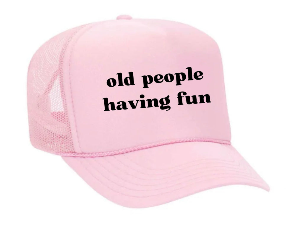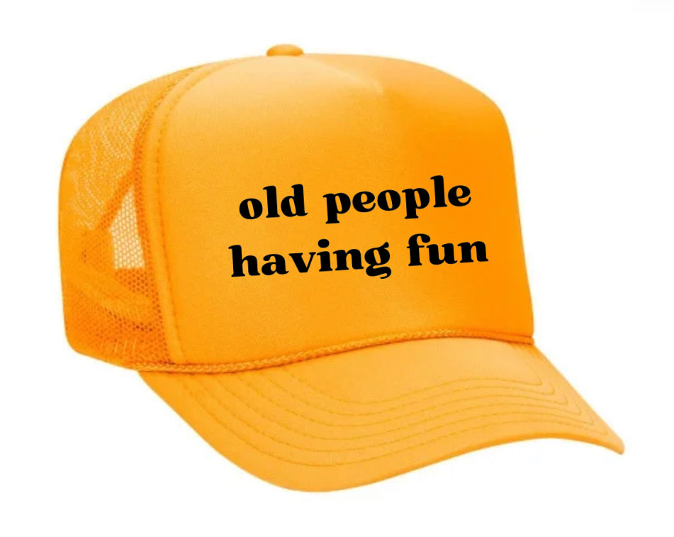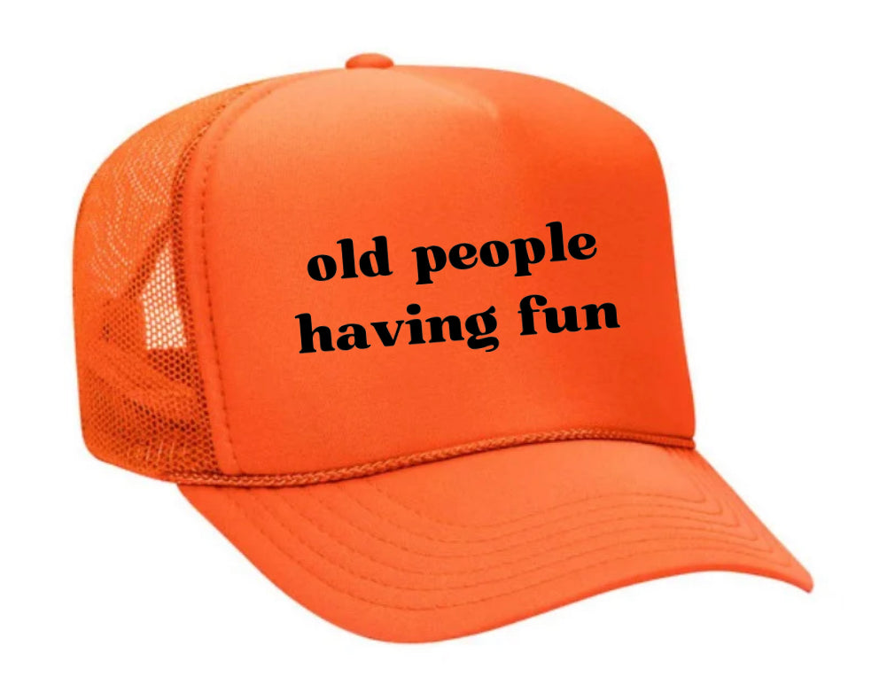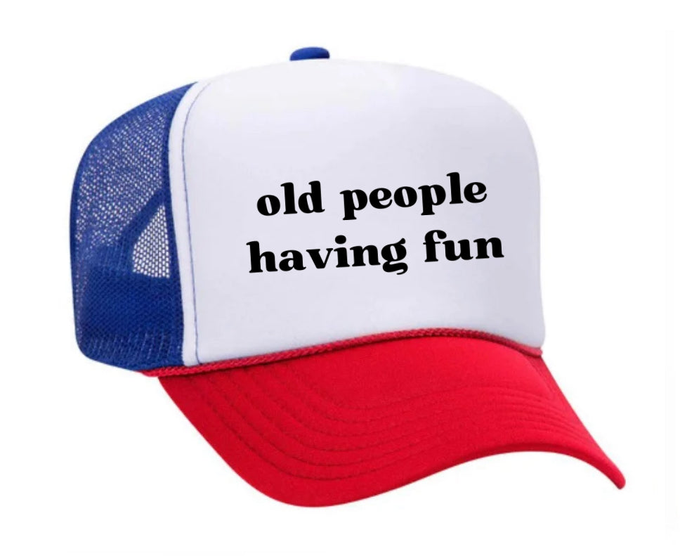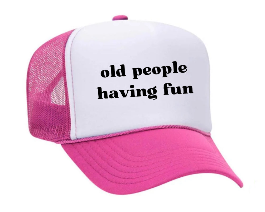 Discover the joy of aging with the Old People Having Fun Trucker Hat. Made for the young at heart, this hat reminds us all that age is just a number. Embrace the wisdom and experience that comes with getting older, and let this hat be a testament to the fact that fun never fades.