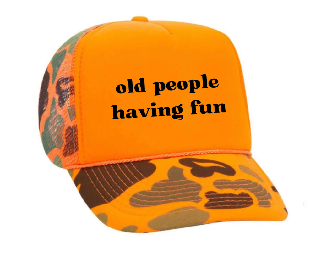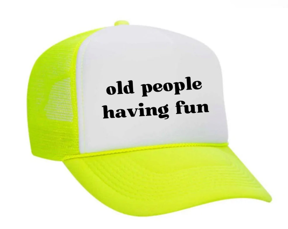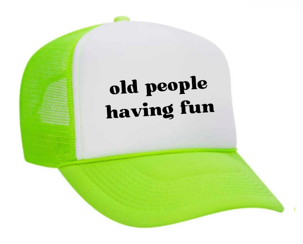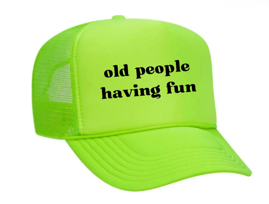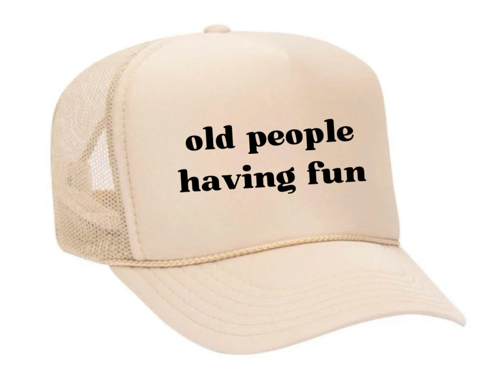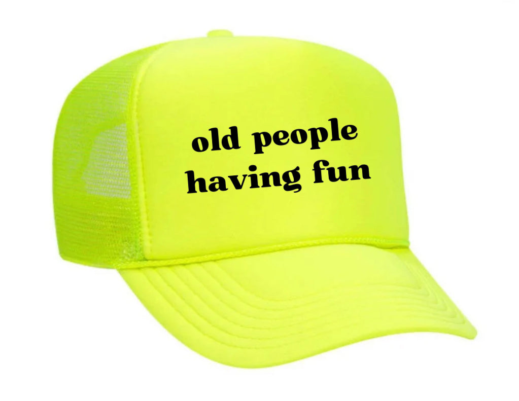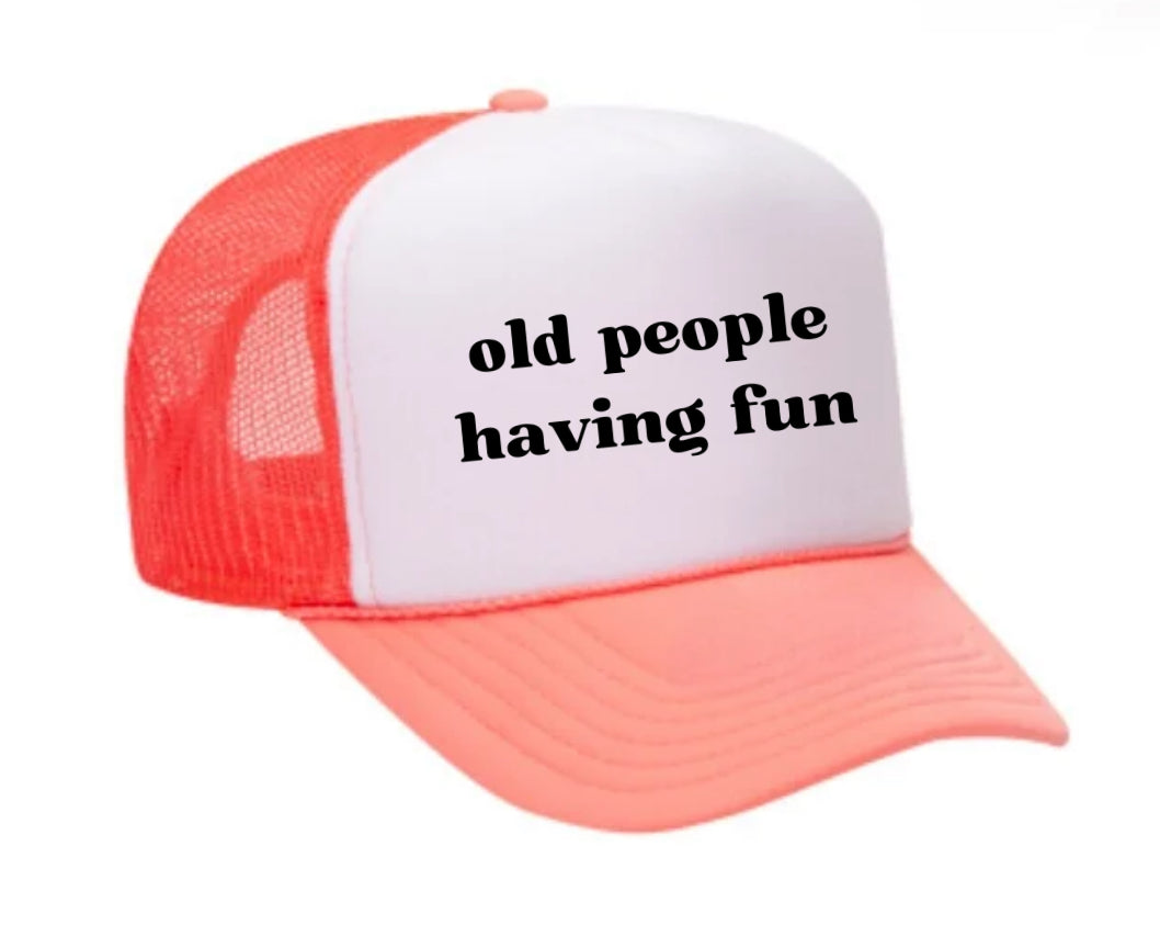 Discover the joy of aging with the Old People Having Fun Trucker Hat. Made for the young at heart, this hat reminds us all that age is just a number. Embrace the wisdom and experience that comes with getting older, and let this hat be a testament to the fact that fun never fades.