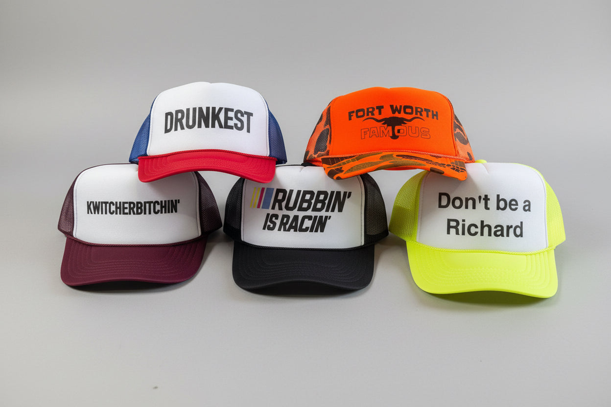 - 5 premium trucker hats (one size fits most)