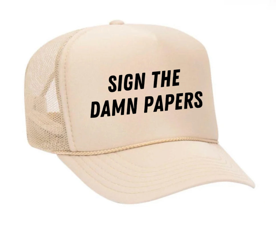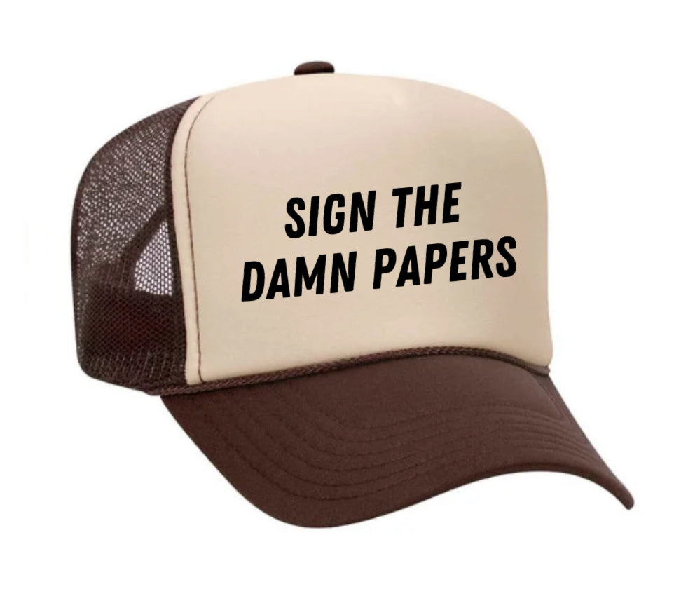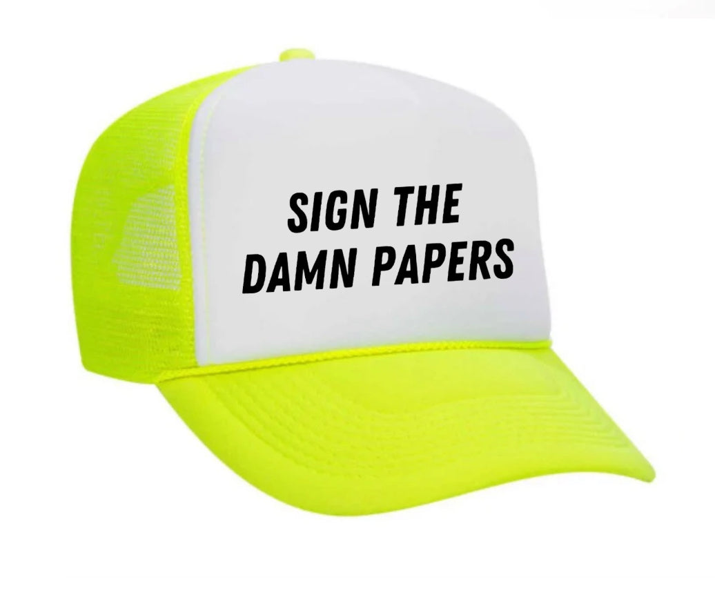 Get your paperwork done in style with our "Sign The Damn Papers" trucker hat. Perfect for those who have a tendency to procrastinate, this hat will remind you to get things done. Made with high-quality materials, it's both fashionable and functional. Don't wait any longer, grab yours today!