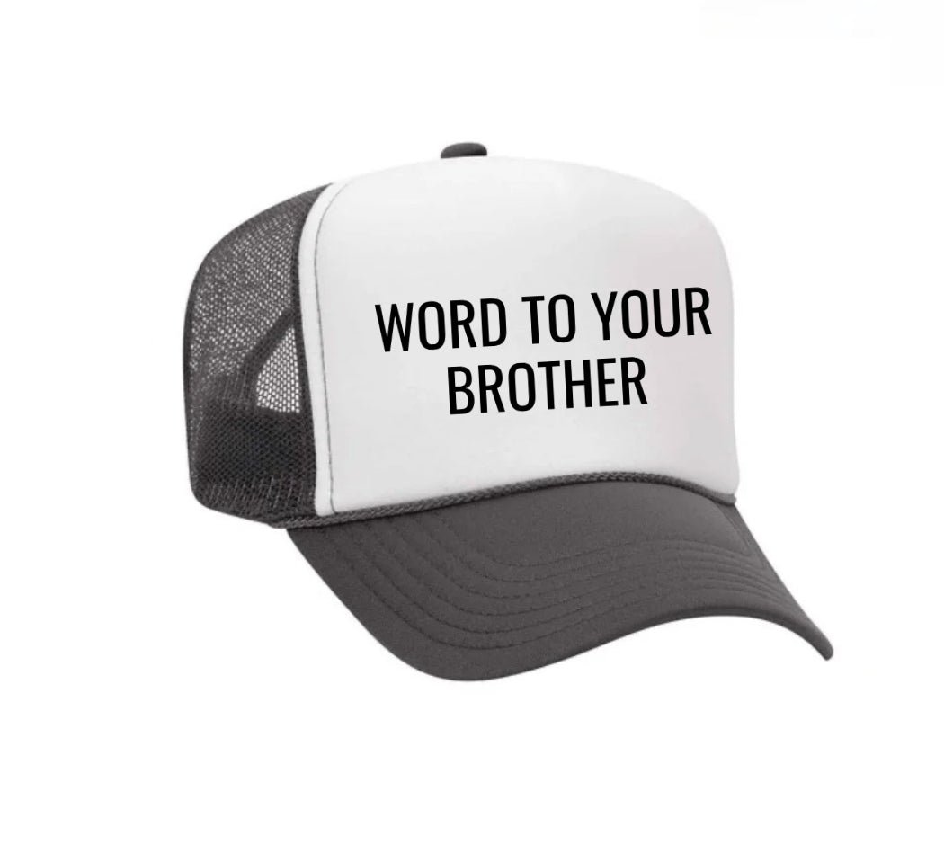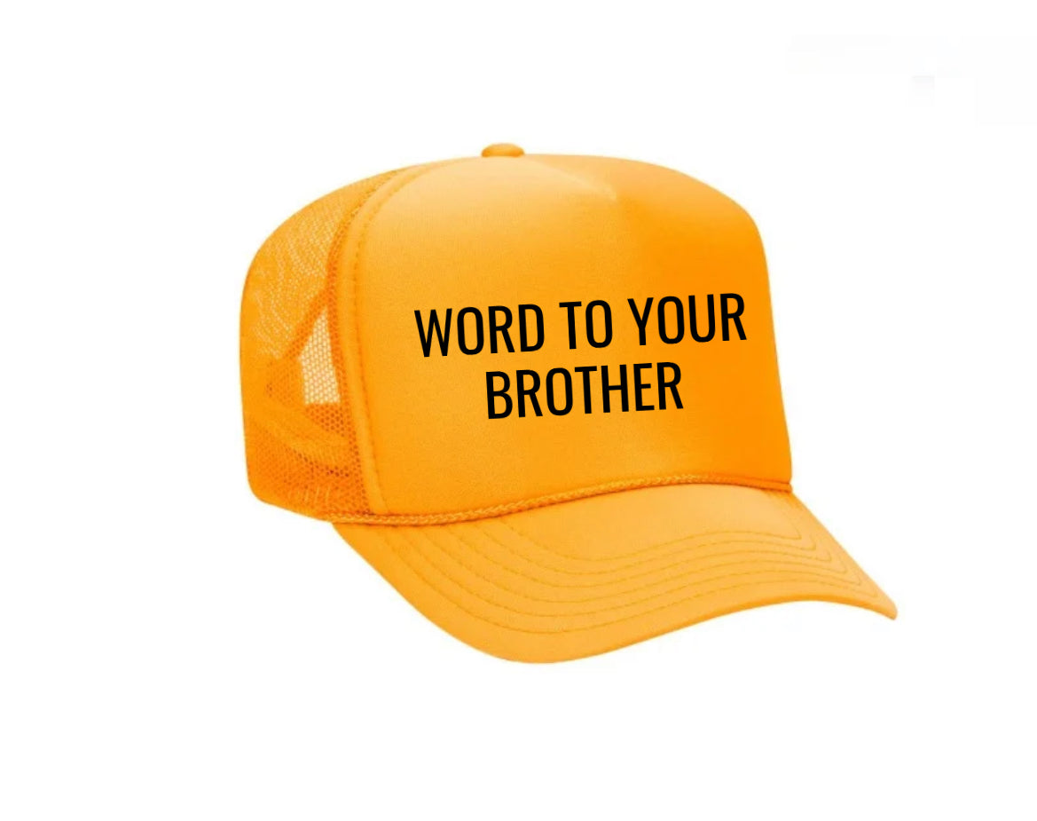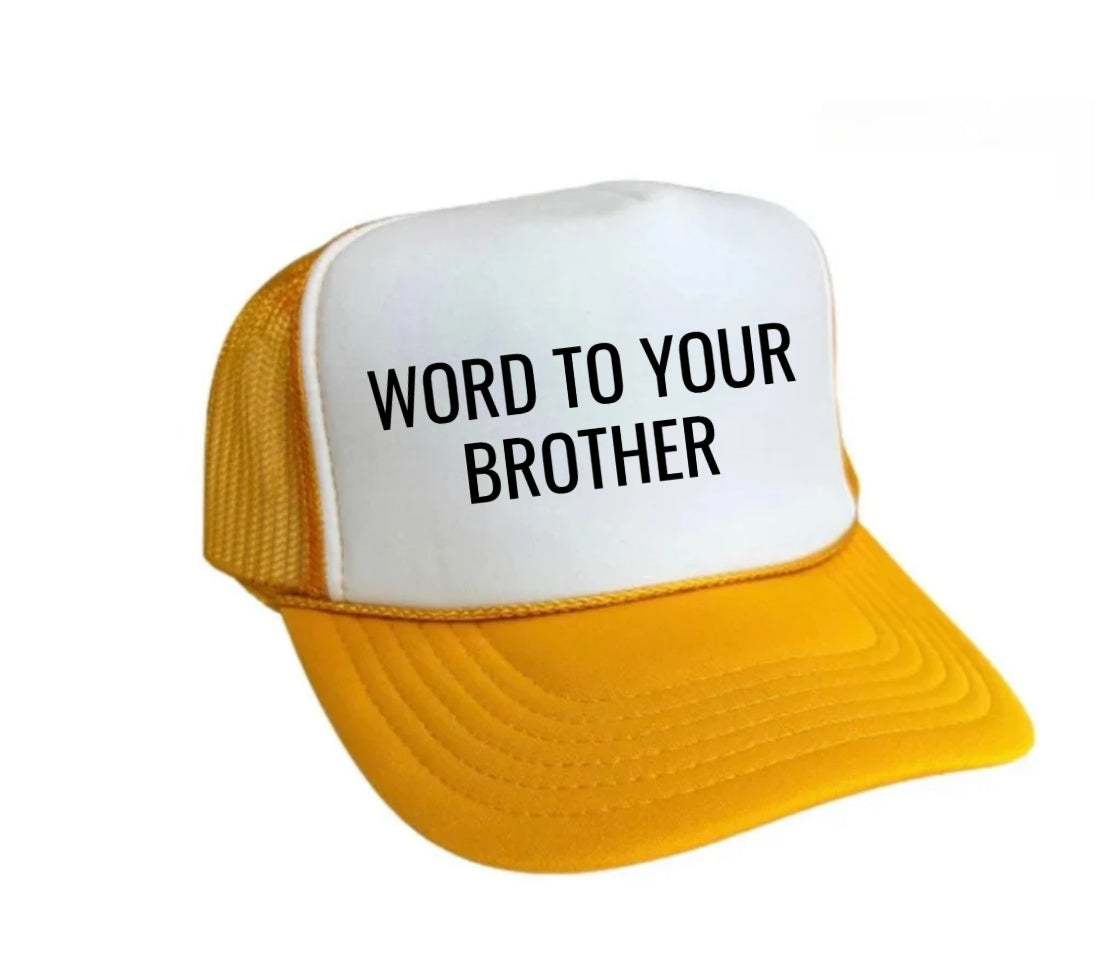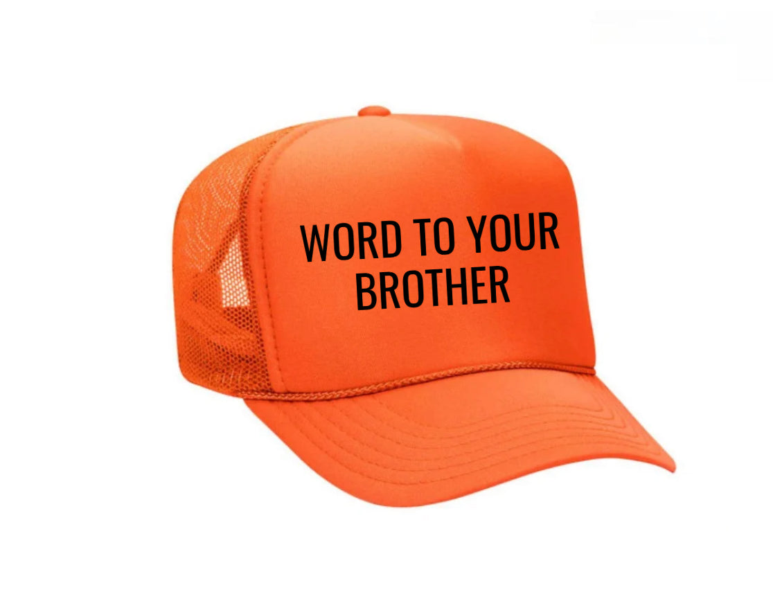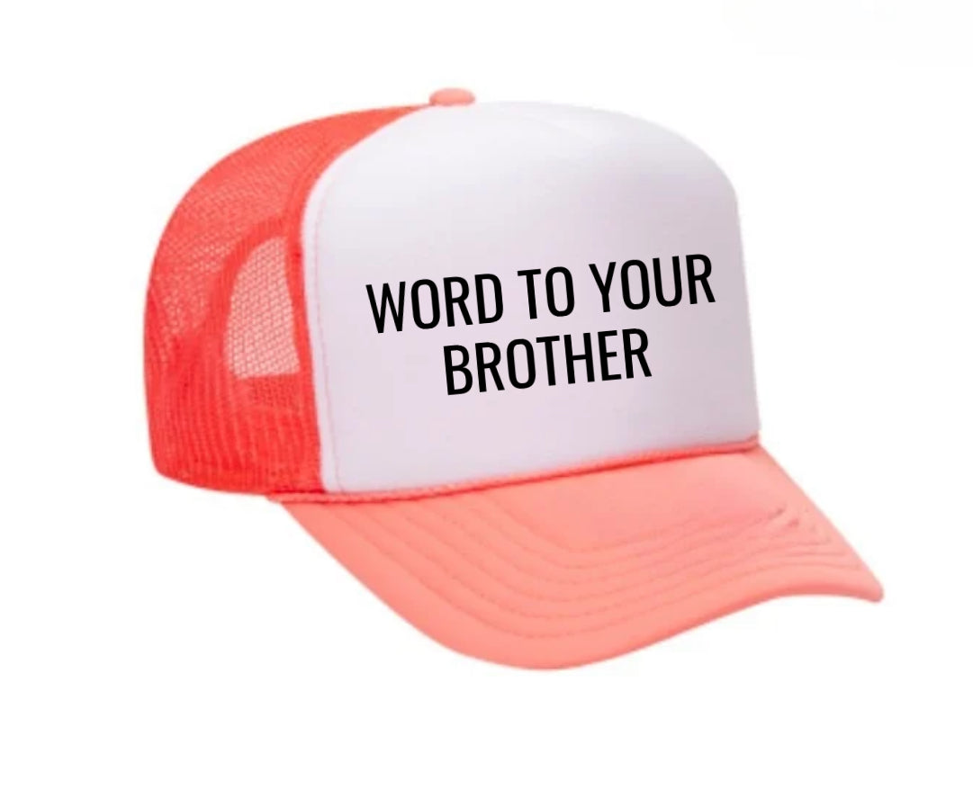 Spread good vibes with the Word To Your Brother Trucker Hat. This playful cap is perfect for showing some love and keeping things lighthearted while adding a fun touch to your everyday look. Wear it and share the brotherly spirit wherever you go!