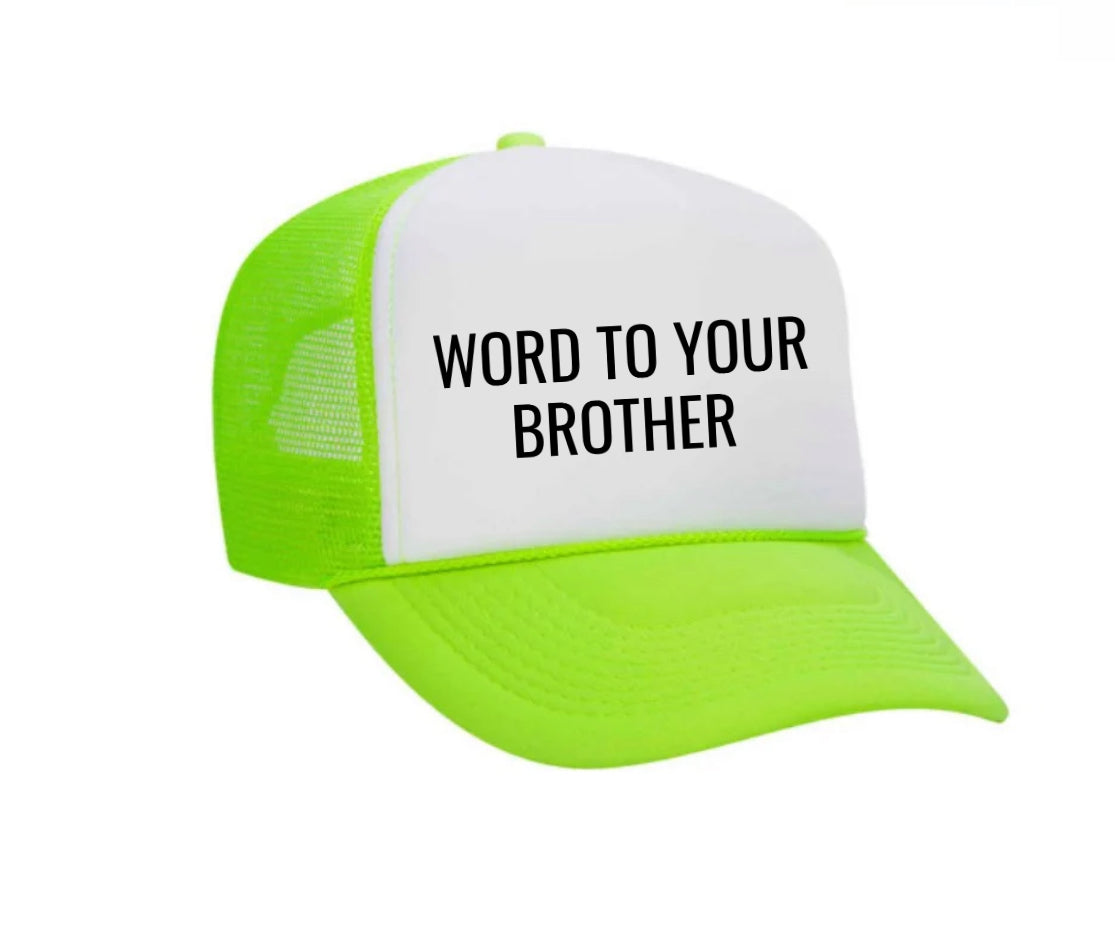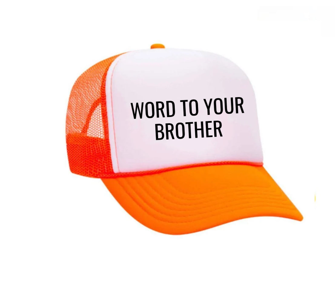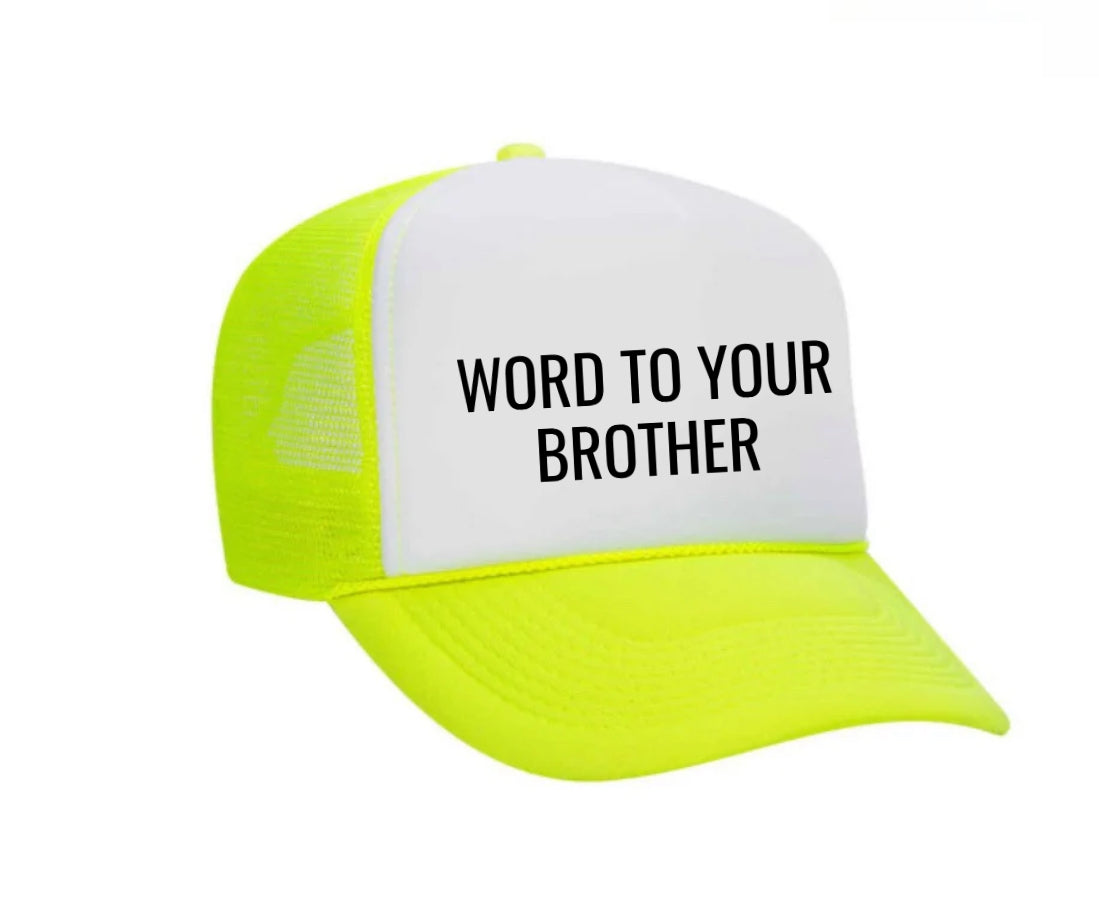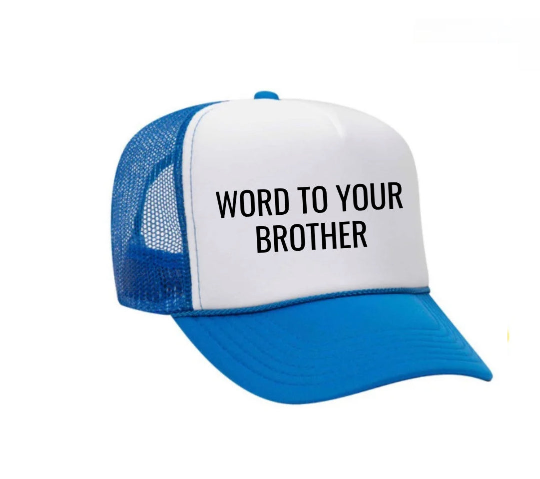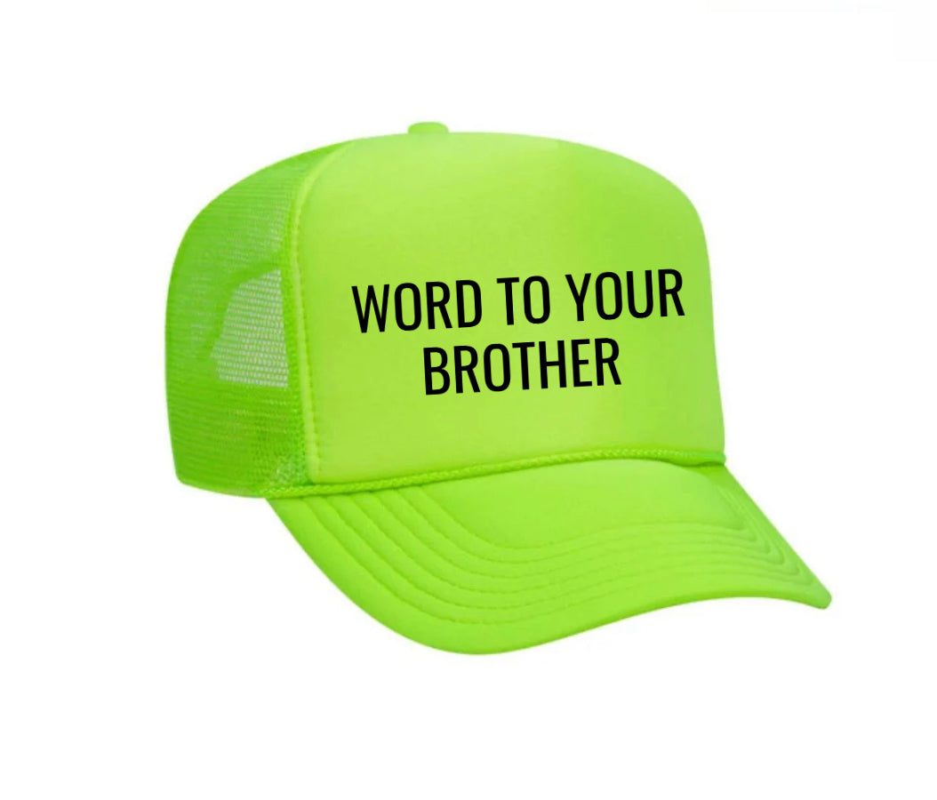 Spread good vibes with the Word To Your Brother Trucker Hat. This playful cap is perfect for showing some love and keeping things lighthearted while adding a fun touch to your everyday look. Wear it and share the brotherly spirit wherever you go!