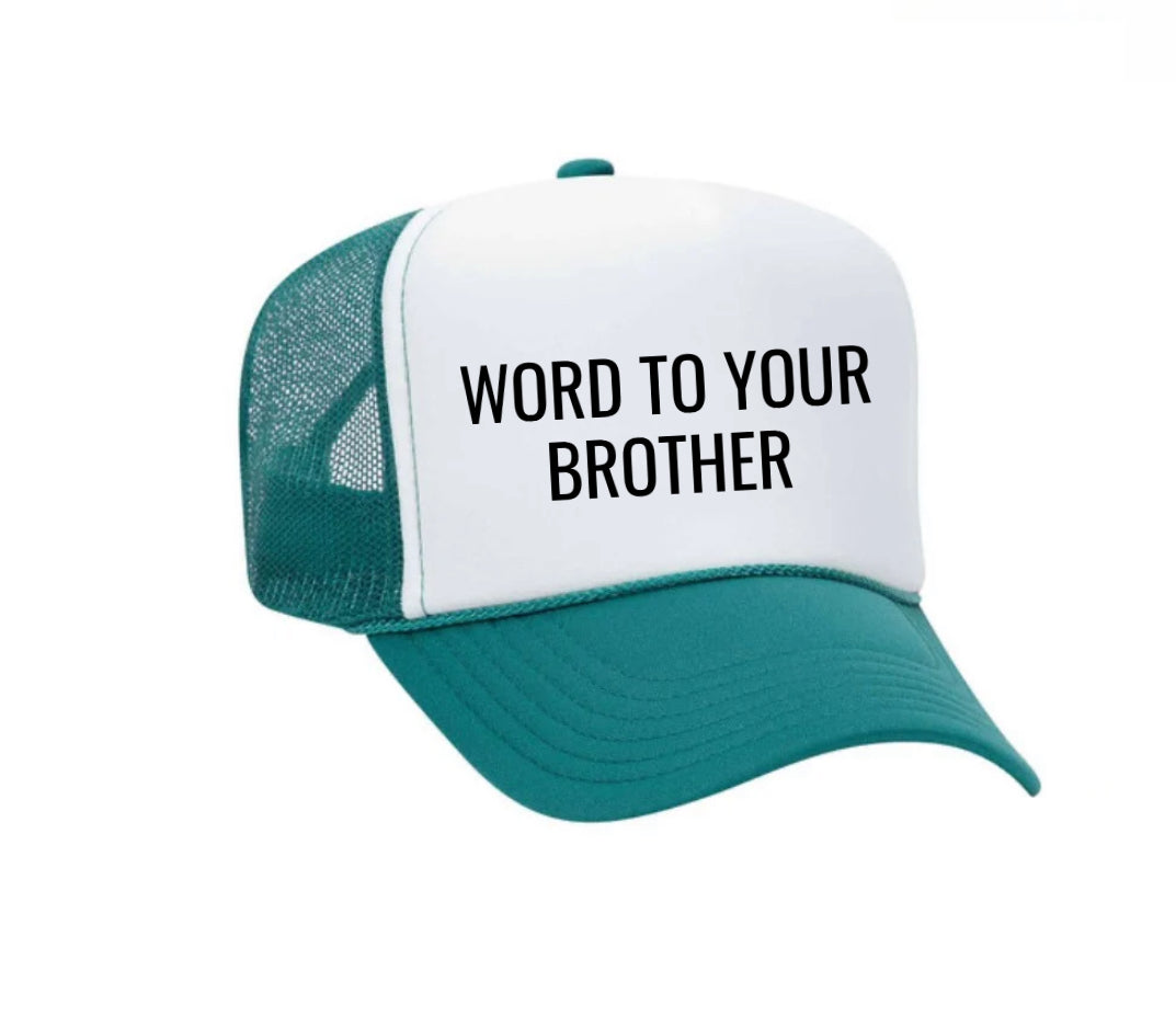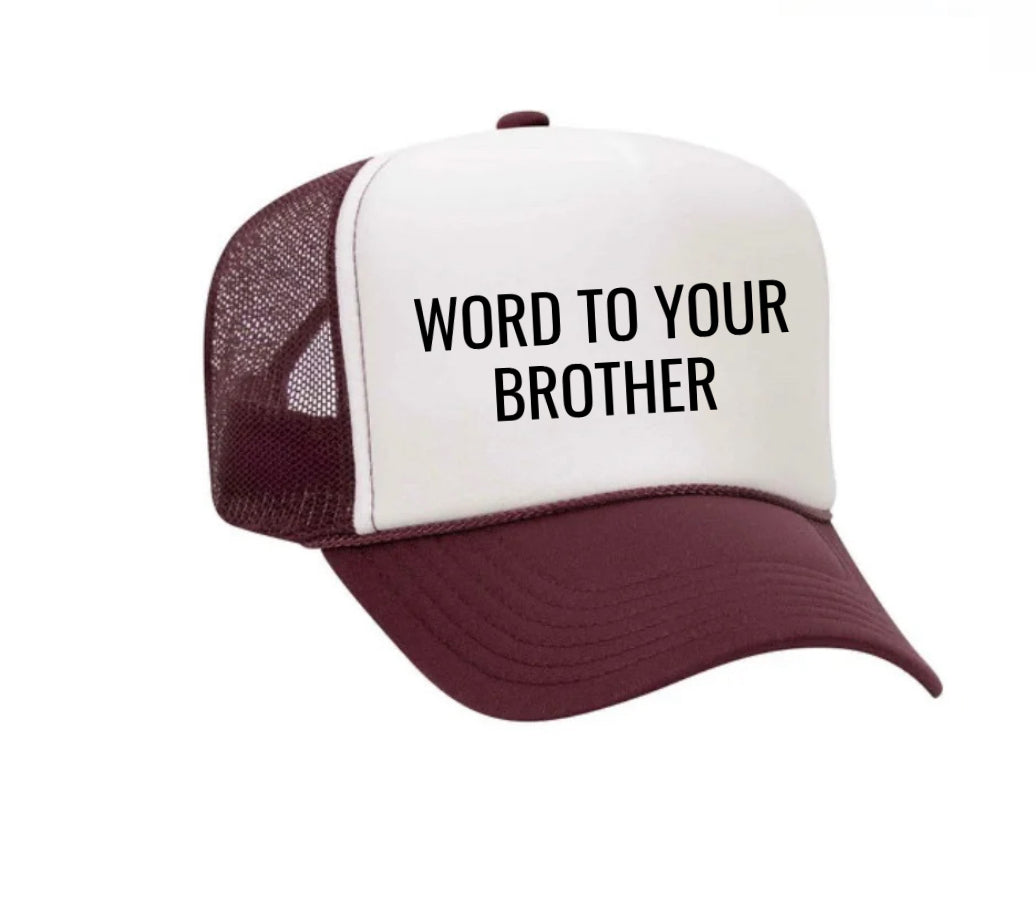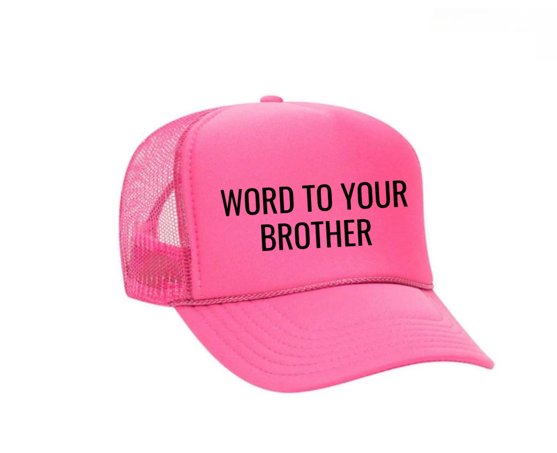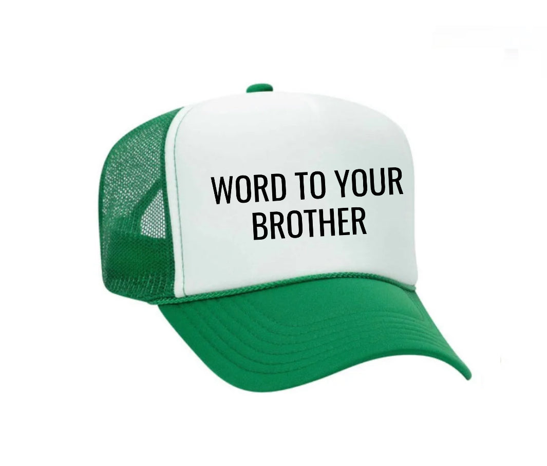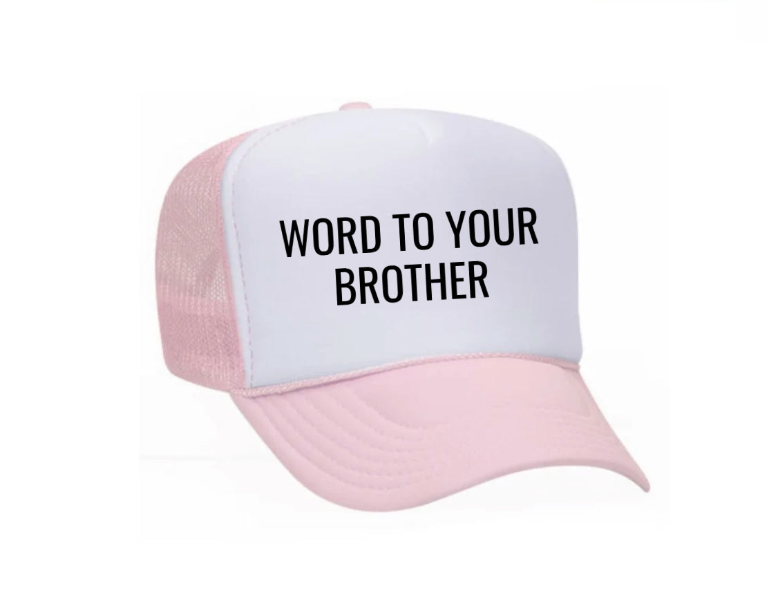 Spread good vibes with the Word To Your Brother Trucker Hat. This playful cap is perfect for showing some love and keeping things lighthearted while adding a fun touch to your everyday look. Wear it and share the brotherly spirit wherever you go!
