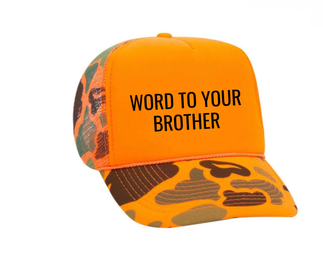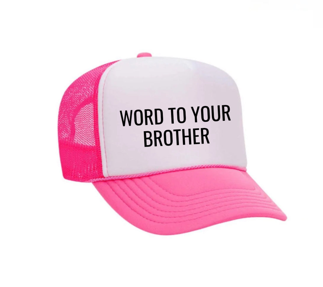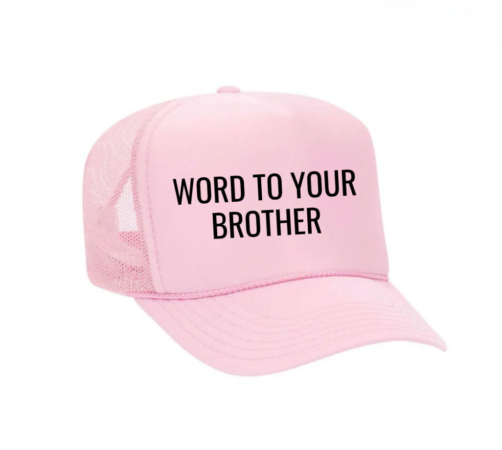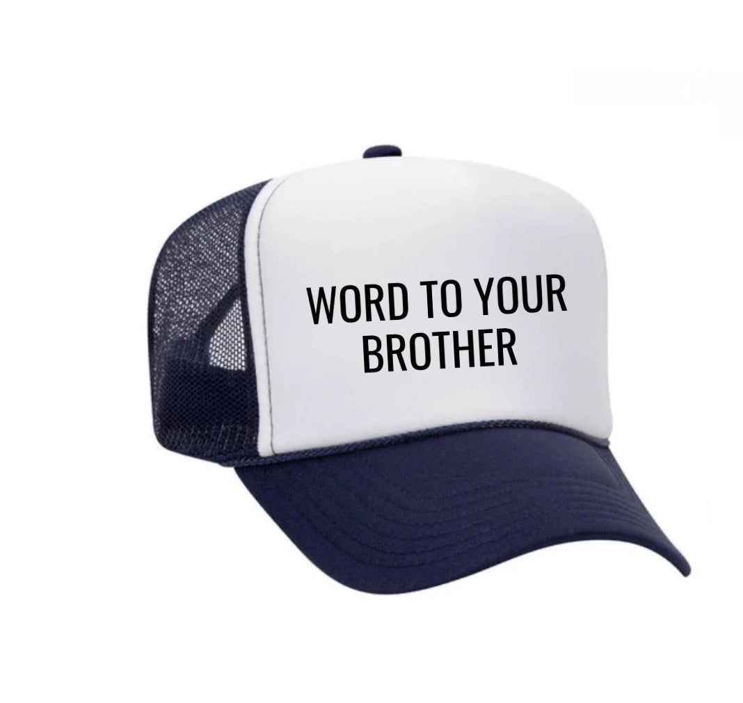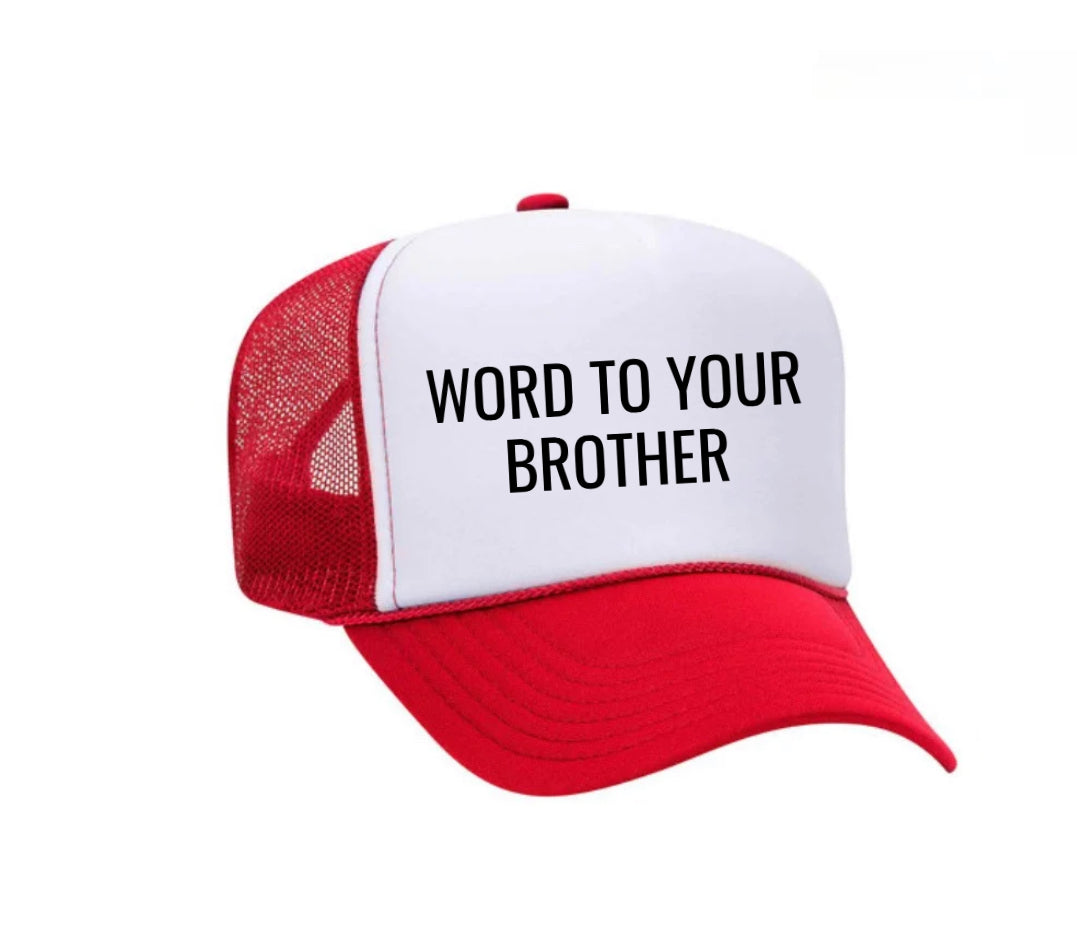 Spread good vibes with the Word To Your Brother Trucker Hat. This playful cap is perfect for showing some love and keeping things lighthearted while adding a fun touch to your everyday look. Wear it and share the brotherly spirit wherever you go!