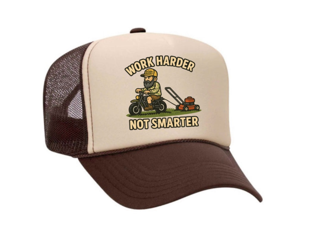 "Be bold and conquer any challenge with our Work Harder Not Smarter Trucker Hat! This hat features a picture of Bobby Chunk, pulling a lawnmower with his minibike, as a reminder to take risks and embrace adventure. Let this hat be your motivation to work smarter, not harder. Don't settle for the status quo, be a risk-taker!"
